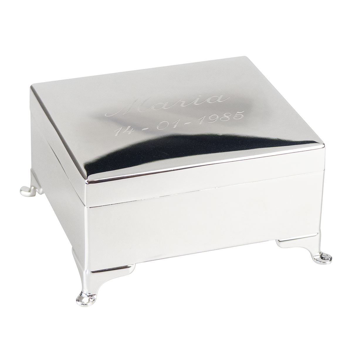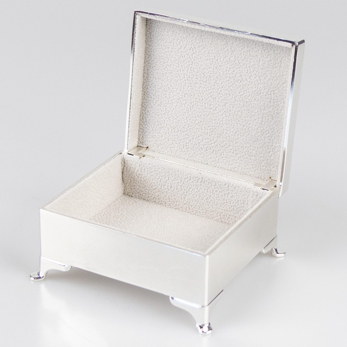 Stilrent nysilver-skrin med mjuk inredning.